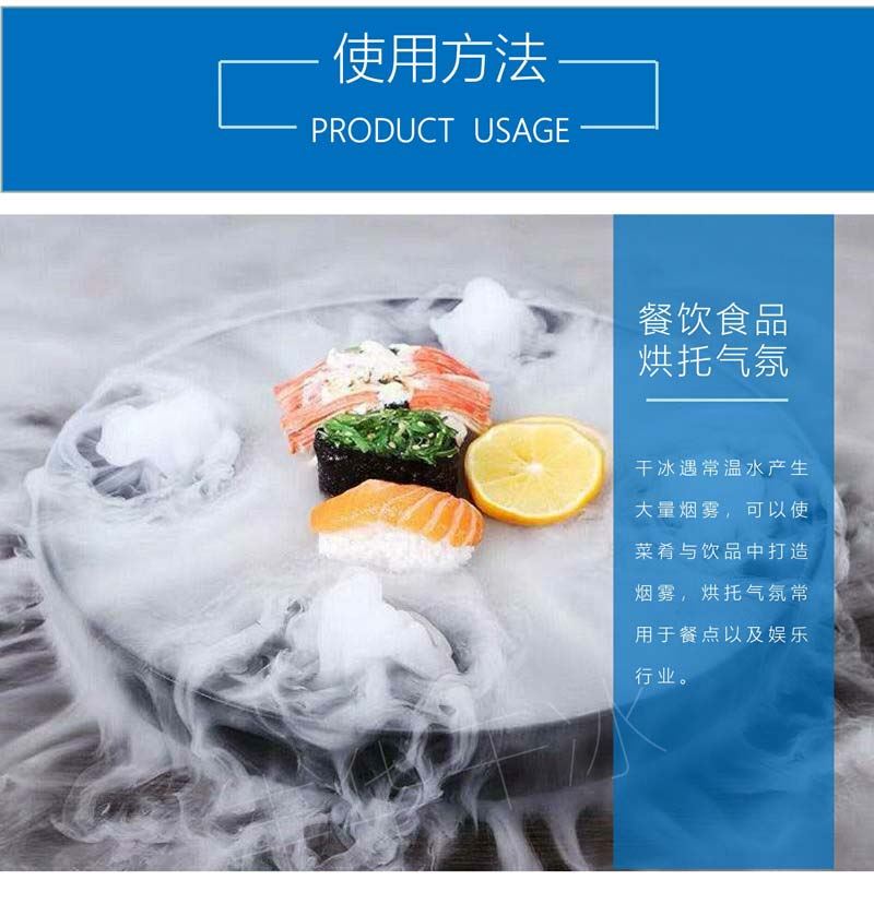 4、用于食品領域,食用干冰還常常作為配料加入冰激凌、飲料中,飲用時涼爽可口,大大提升了飲品的口感。干冰特別適合外賣冰淇淋的冷藏。